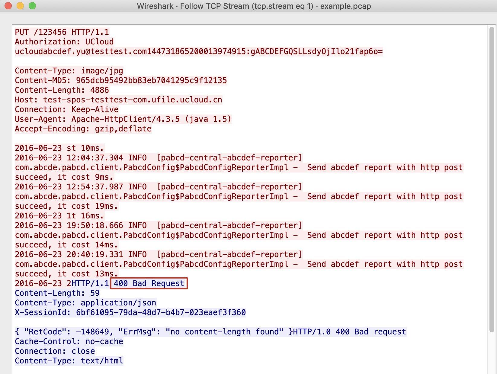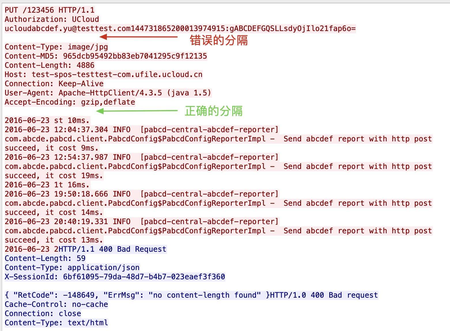 原来如此,这次的400 Bad Request的根因,是客户发送的HTTP PUT请求的格式出现了问题。它违背了HTTP/1.1(RFC2616)的规定,在Authorization头部后面,错误地添加了两次回车(CRLF)。这样就导致服务端认为,后续的数据都属于payload,也就导致服务器无法正常读取这个请求,只能用HTTP 400来反馈这种状况了。