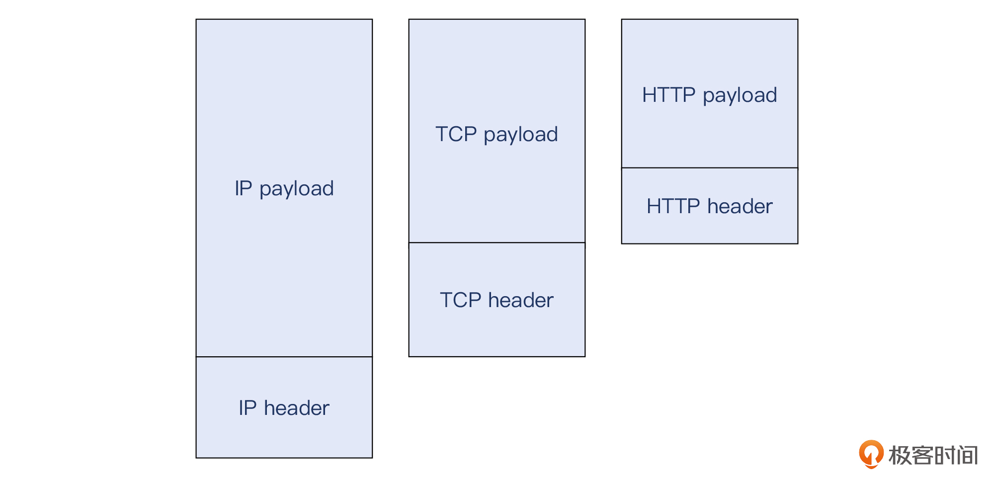 在IP协议里,IP header是用一个Total Length字段,表示了包含IP头部在内的整个IP报文的长度。那怎么区分IP头部和载荷呢?IP头部还有一个字段是Header Length,表示了头部自身的长度。这样两个Length值的差,就是IP载荷的大小了。