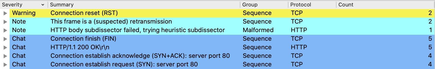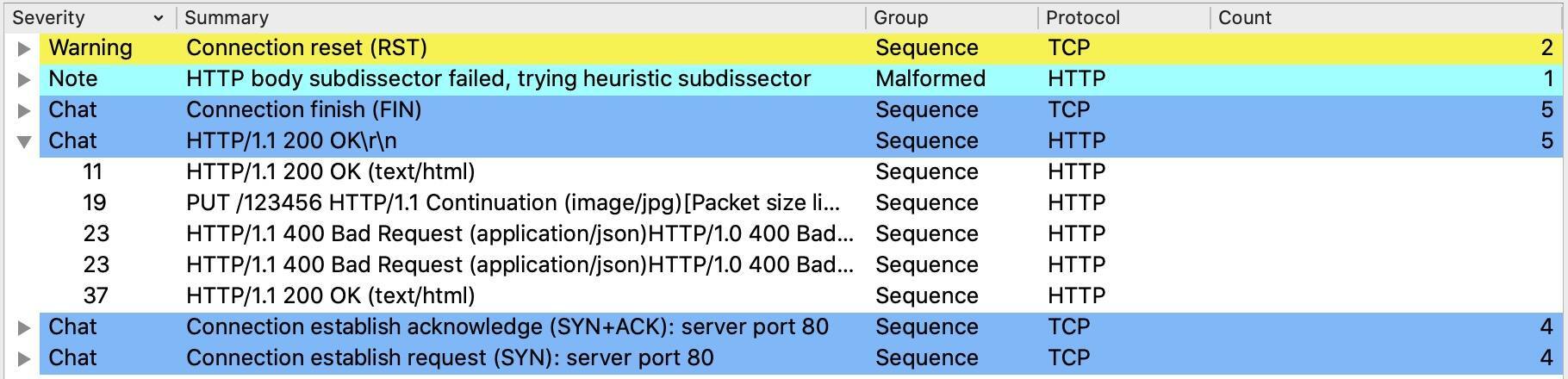 补充:这里我修改过抓包,所以展现在Expert Information里面的样子,跟正常抓取完整报文的情况略有不同。比如这个示例文件里,第一个HTTP报文其实是POST,那么Summary栏显示的,应该是POST请求而不是HTTP/1.1 200 OK。但是,这不影响排查和分析。