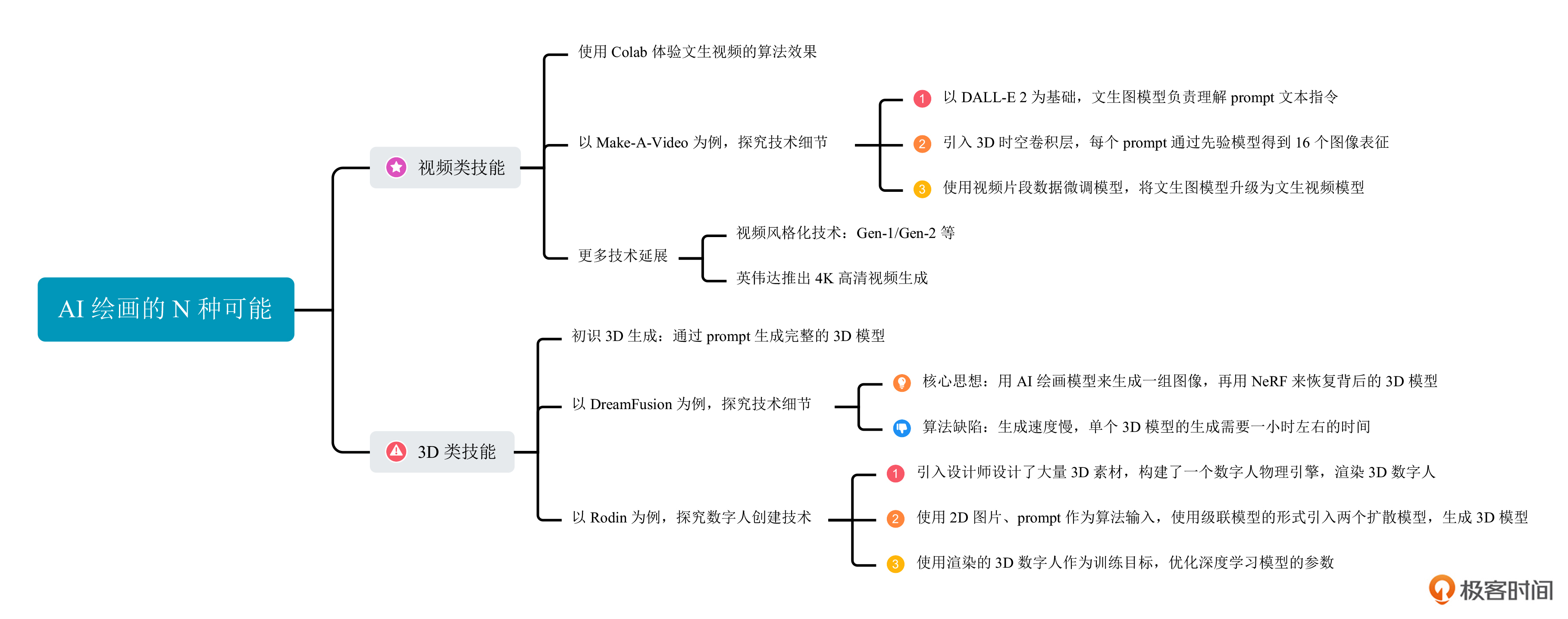 其实这些图像相关的技能仅仅是AI绘画的基本能力。今天这一讲我会带你了解三个更高阶的AI绘画能力,分别是文生视频技术、通用3D生成技术和数字人技术。见识了这些更高级的技术,你对于AI绘画的无限潜能一定会有更清晰的认识。在之后的求职择业中,你也可以选择一个感兴趣的切入点,持续地深入下去。