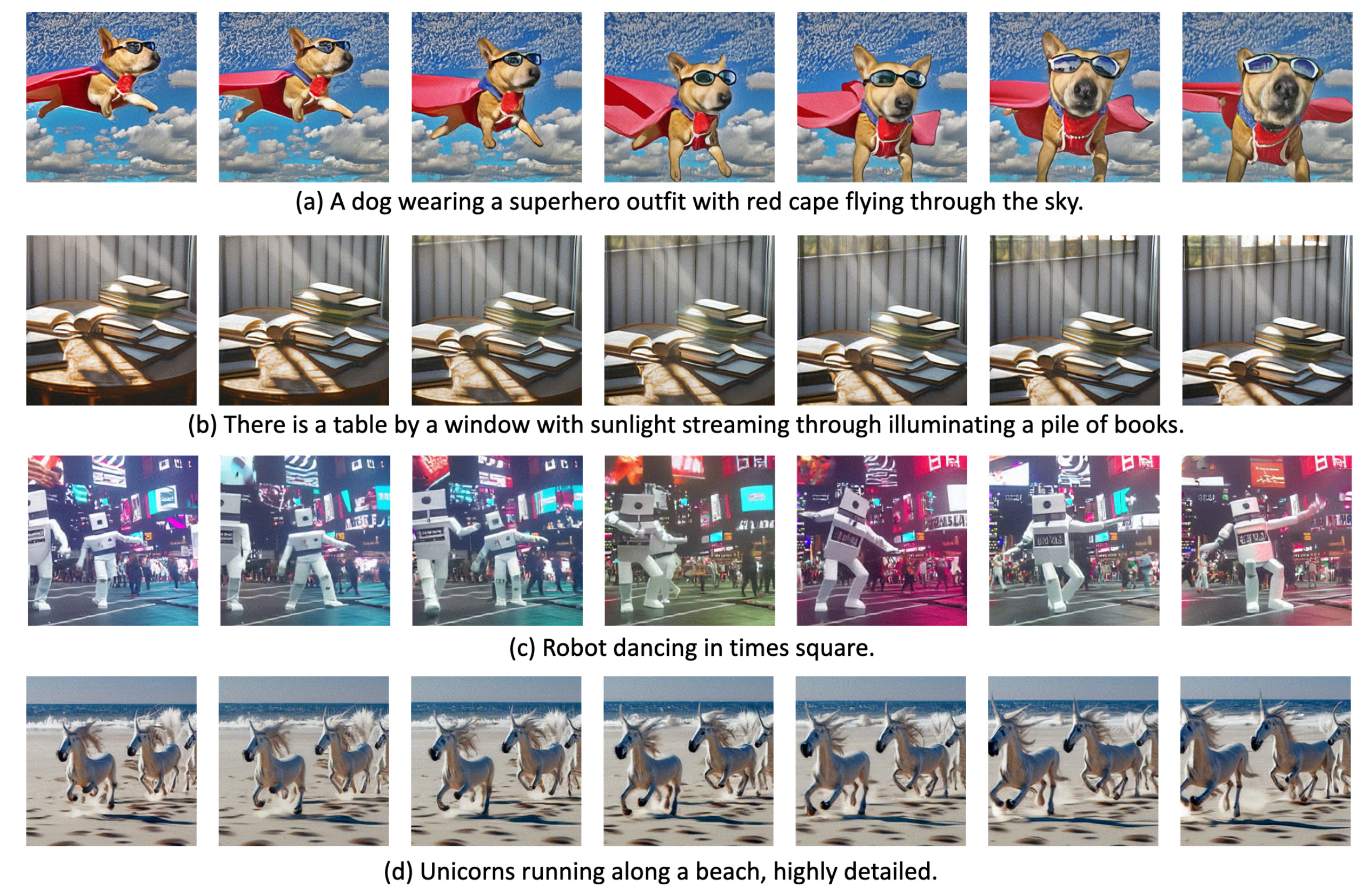 我们可以看到,每一帧图像都满足prompt指令的限制,并且前后帧之间有着良好的连续性。这里的连续性,你可以理解为将这些图像帧按照顺序连接成视频,“剧情”是连贯的。