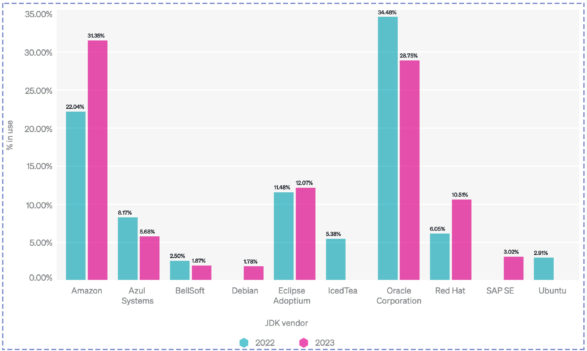 可是在New Reliic的报告中,我们发现亚马逊才是现在最受欢迎的JDK供应商。因为Oracle JDK的商业收费政策、Open JDK的蓬勃发展,再加上现在越来越热的信息技术应用创新,很多一线大厂开始打造自己的JDK版本。其中就包括阿里巴巴在2019年3月开源的Dragonwell,腾讯2019年11月开源的Kona,以及华为在2020年9月发布的**毕昇。**今天当你开始在生产环境中使用Java的时候,选择哪个JDK供应商已经成为了一个需要考虑的选项。