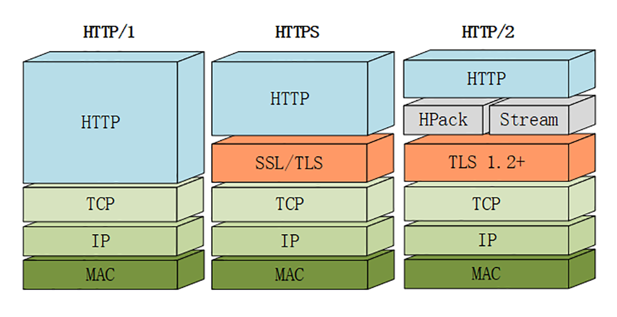 下面的这张图对比了HTTP/1、HTTPS和HTTP/2的协议栈,你可以清晰地看到,HTTP/2是建立在“HPack”“Stream”“TLS1.2”基础之上的,比HTTP/1、HTTPS复杂了一些。