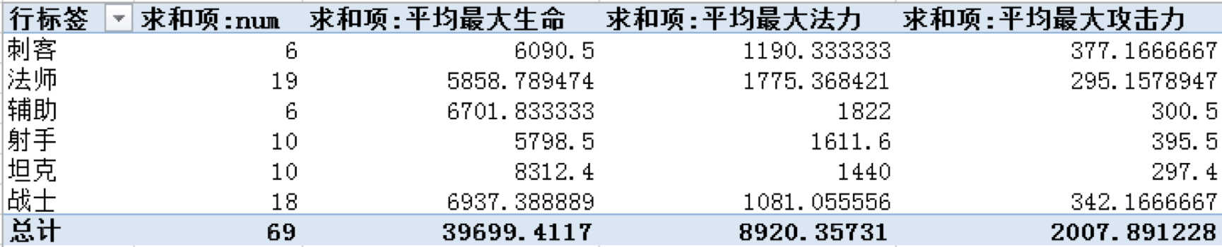 1 | SELECT role_main, avg(hp_max) AS `平均最大生命`, avg(mp_max) AS `平均最大法力`, avg(attack_max) AS `平均最大攻击力`, count(*) AS num FROM [heros$] GROUP BY role_main |