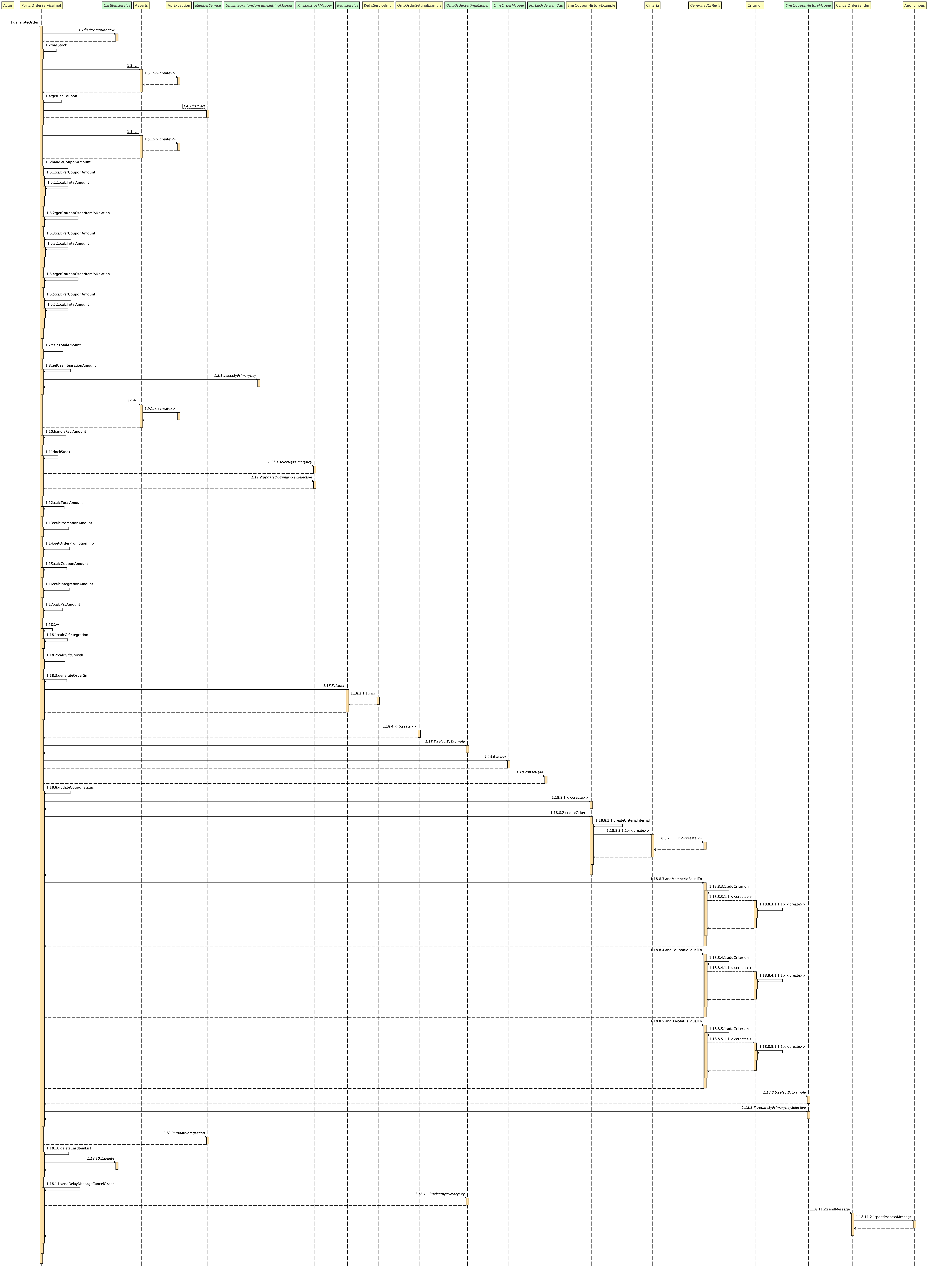 我们回到正题,既然我们想优化业务,就得先知道业务的调用逻辑是个啥样子。所以我们打开idea,找到generateOrder方法,然后把sequence diagram(idea的一个插件)打开,就看到了这样一张很长的业务逻辑图: