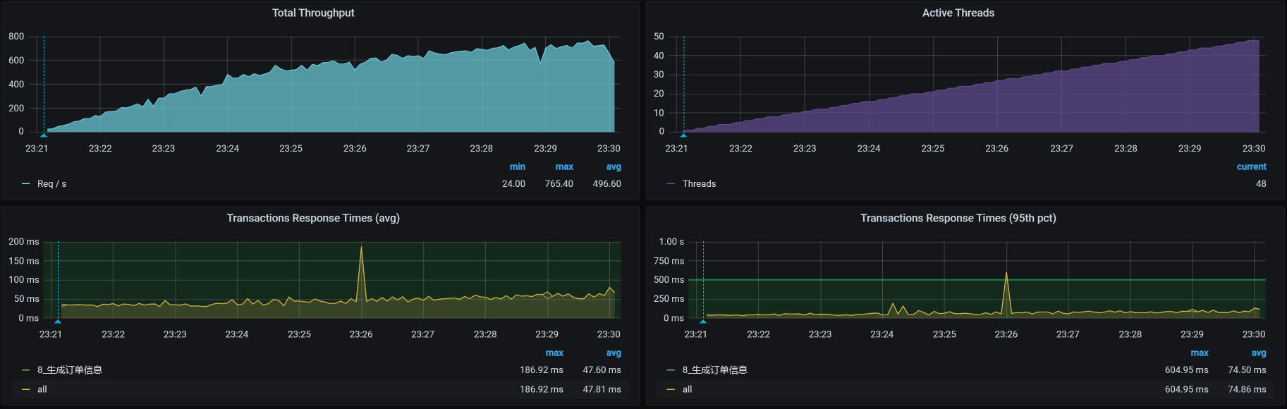 从优化效果来看,TPS已经达到700以上了。对这样一个复杂的接口来说,这已经非常不错了。