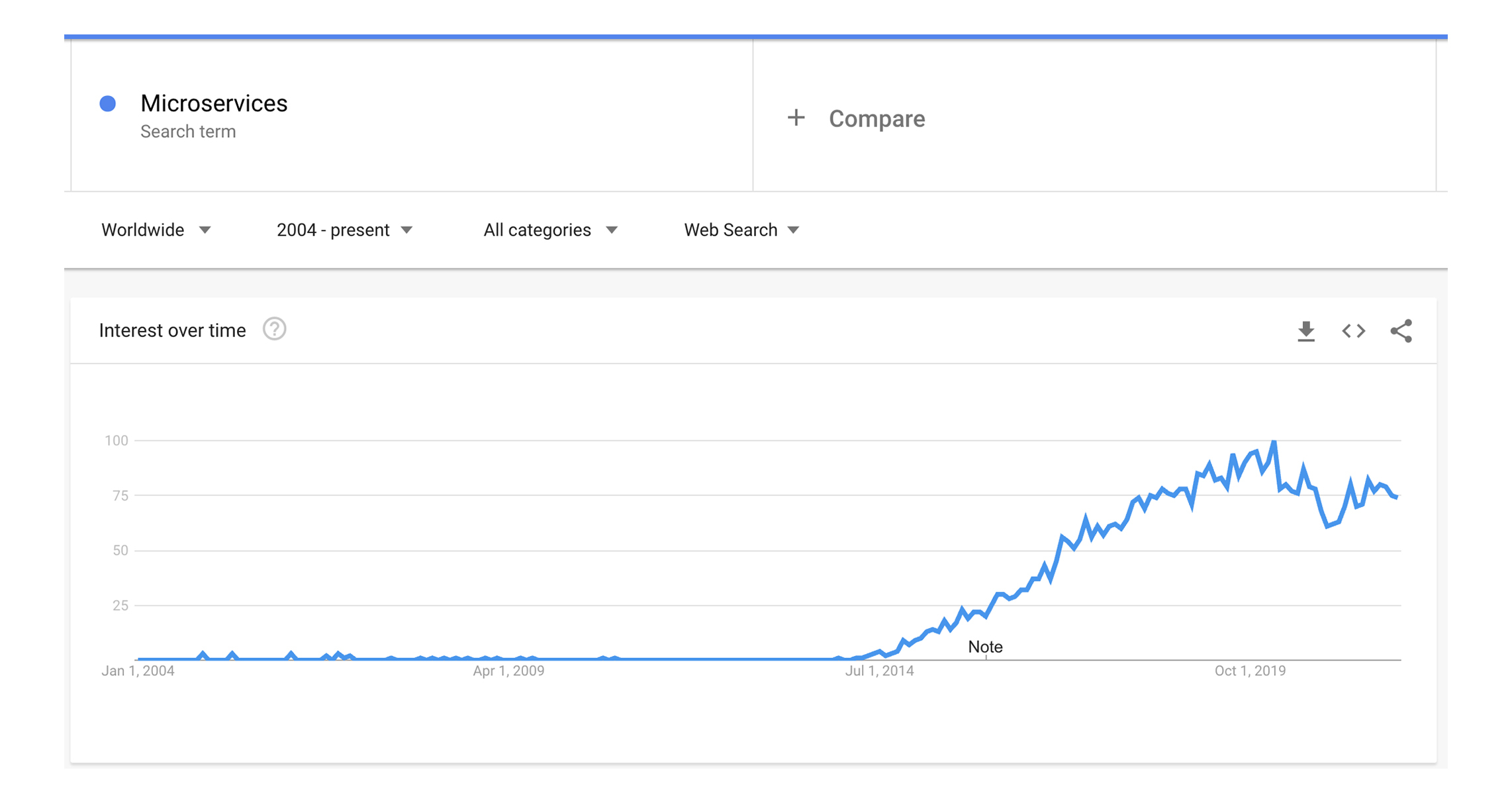 即便你是刚参加工作的萌新,也一定从铺天盖地的“微服务”相关信息流中了解到了这个名词的热度。谷歌搜索指数显示,自2014年起,微服务的搜索热度一路上升。