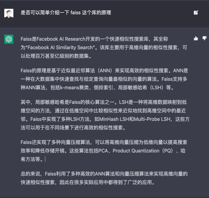 Faiss的原理,是通过ANN这样的近似最近邻的算法,快速实现相似性的搜索。如果你想进一步了解Faiss的原理,你也可以去问问ChatGPT。