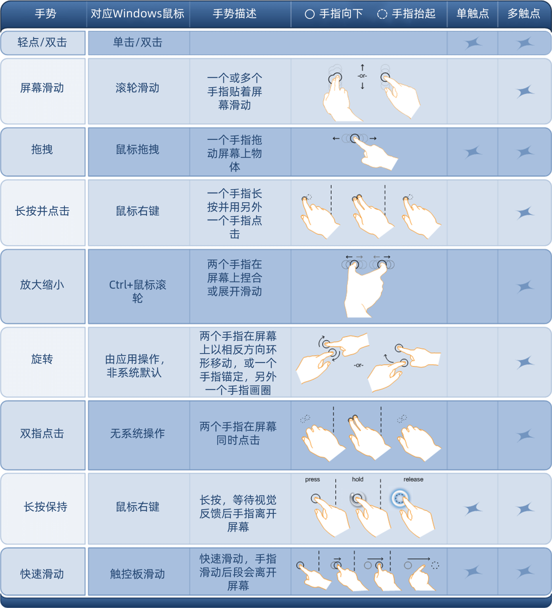 除了显示的一致性,操作体验一致性也很重要。比如我们要把鼠标的点击和触屏操作体验做好对应,避免用户在切换不同设备后,操作体验不够顺畅和自然。比如在下面微软的操作规范里,你可以看到微软把触屏的手势和电脑鼠标的操作做了符合用户习惯认知的映射。