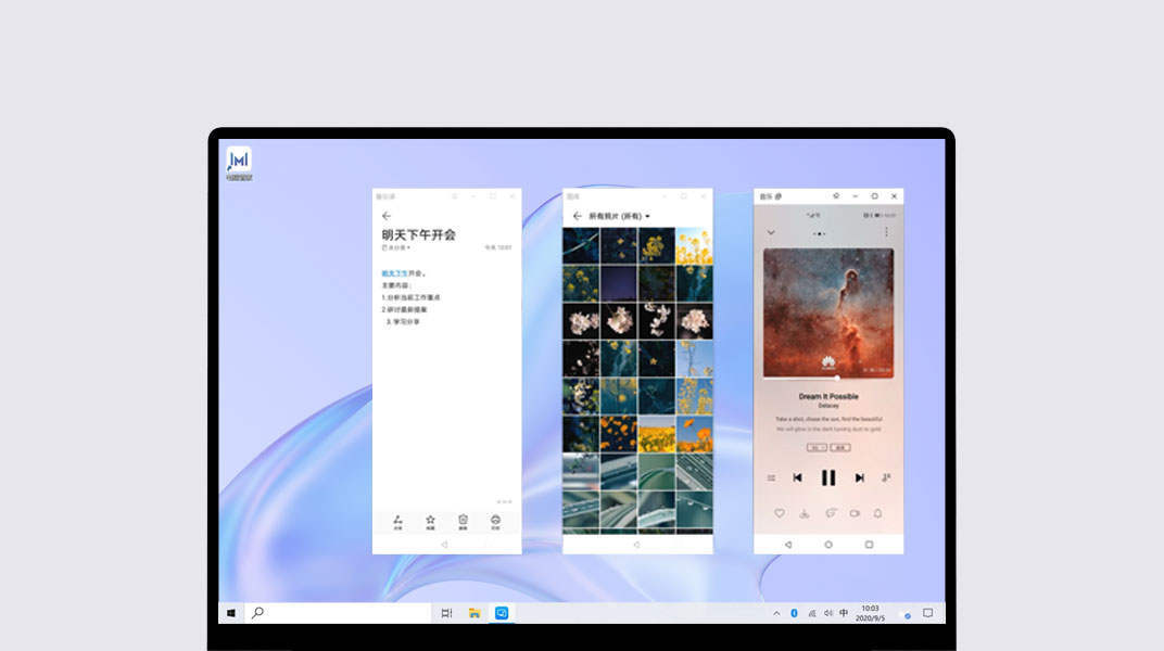 但如果把手机屏幕投到电脑等大屏幕设备上,电脑优秀的处理性能和巨大的屏幕空间,已经没有必要约束着自己只显示一个前台单任务了。因此手机的很多藏在后台的任务,在电脑上可以并行放在一起,实现手机上无法实现的多窗口业务特性,如下就是华为在MateBook上运行手机的多任务示例。