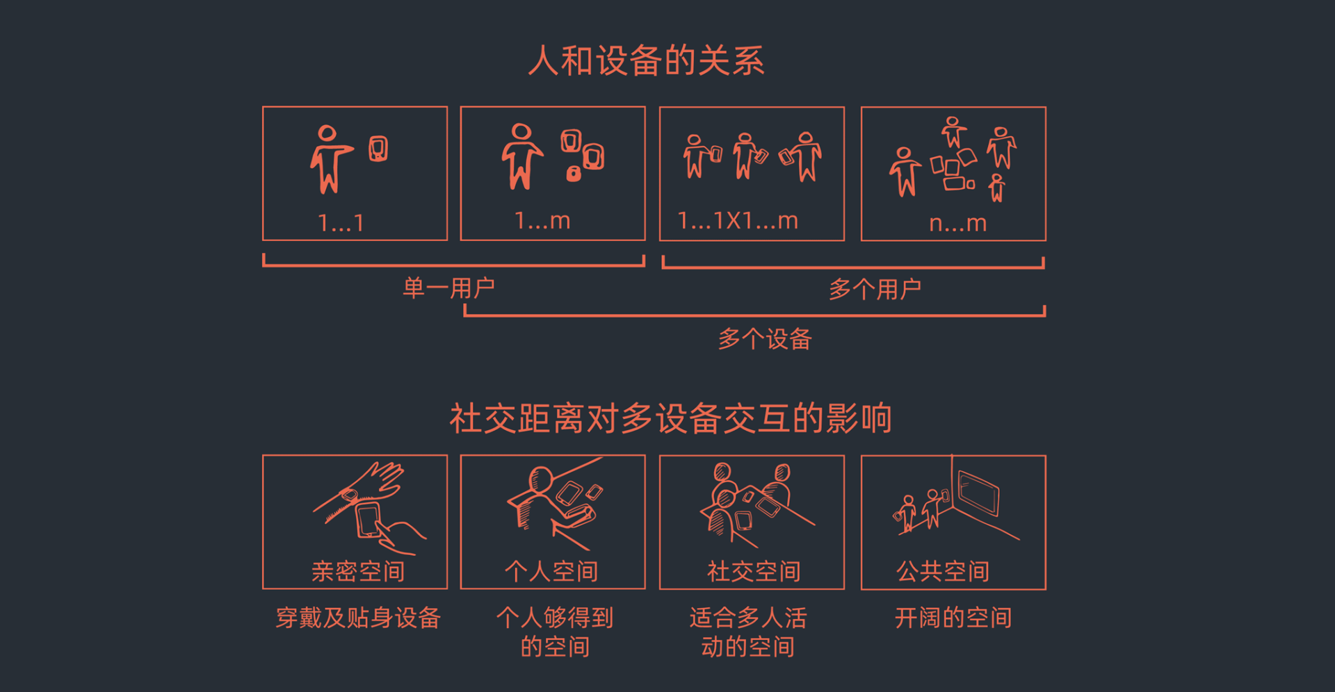 我之所以说是“哪些人”,而不是“哪个人”,是因为以前是一个人对应一个或者多个设备的情况,而现在有些设备并非清晰地带着私人属性,所以会存在更加复杂的多人对应多个设备的情况,再加上社交距离的考量,这种关系会是复杂并且动态变化的。用户或者用户群画像,是我们在进行多设备交互设计时要做的首要动作。