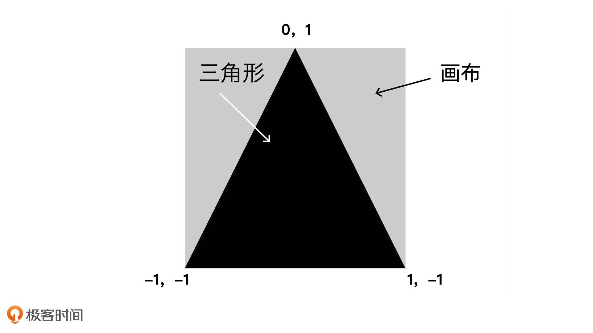 假设,我们要在这个坐标系上显示一个顶点坐标分别是(-1, -1)、(1, -1)、(0, 1)的三角形,如下图所示。因为这个三角形是二维的,所以我们可以直接忽略z轴。下面,我们来一起绘图。