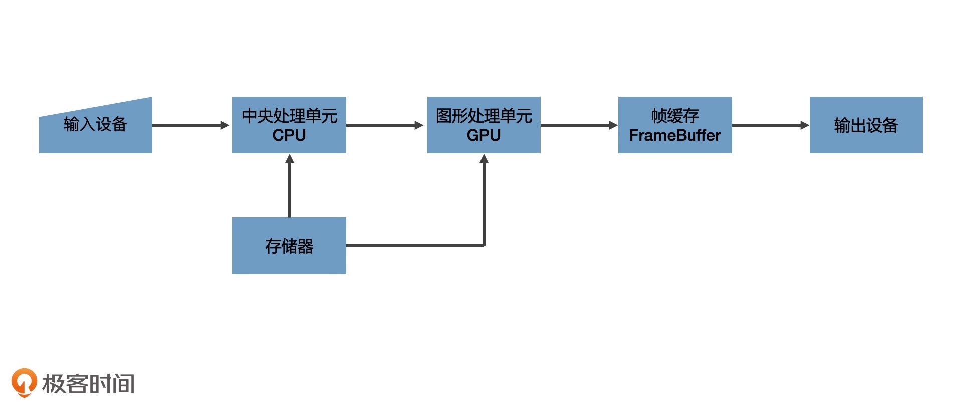 一个通用计算机图形系统主要包括6个部分,分别是输入设备、中央处理单元、图形处理单元、存储器、帧缓存和输出设备。虽然我下面给出了绘图过程的示意图,不过这些设备在可视化中的作用,我要再跟你多啰嗦几句。