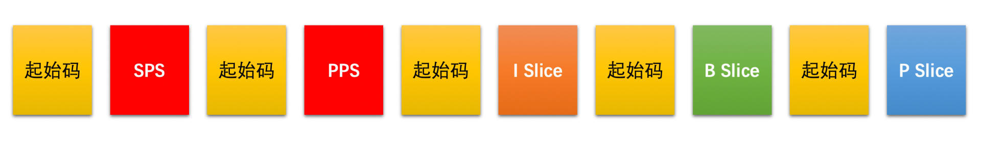 结合前面我们讲的内容,我们现在可以知道,H264码流主要包含了SPS、PPS、I帧、P帧和B帧。由于帧又可以划分成一个或多个Slice。因此,帧在码流中实际上是以Slice的形式呈现的。所以,H264的码流主要是由 SPS、PPS、I Slice、P Slice和B Slice组成的。如下图所示:
