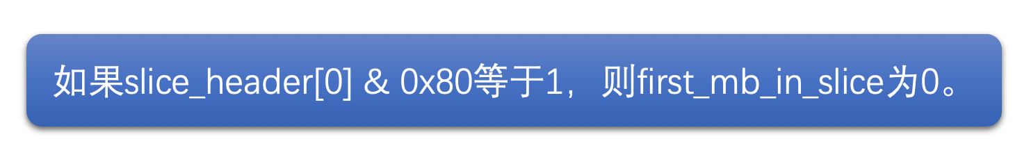 其中,first_mb_in_slice是以无符号指数哥伦布编码的,需要使用对应的解码方式才能解码出来。但是有一个小技巧,如果只是需要判断first_mb_in_slice是不是等于0,不需要计算出实际值的话,只需要通过下面的方式计算就可以了。