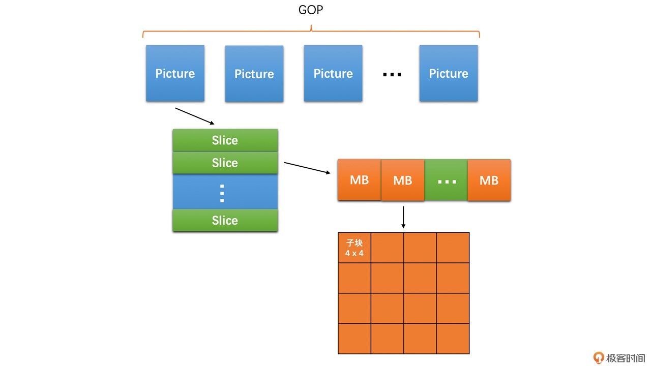 而在H264中编码的基本单元是宏块,所以一个Slice又包含整数个宏块。我们在前一节课中也讲了,宏块MB大小是16 x 16。在做帧内和帧间预测的时候,我们又可以将宏块继续划分成不同大小的子块,用来给复杂区域做精细化编码。