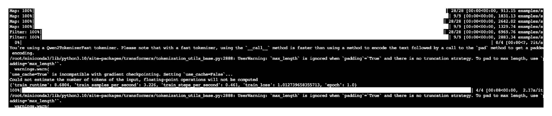 1 2 3 4 5 6 7 8 9 10 11 12 13 14 15 16 17 def preprocess_function(examples): new_examples = { "input_ids_chosen": [], "attention_mask_chosen": [], "input_ids_rejected": [], "attention_mask_rejected": [], } for chosen, rejected in zip(examples["chosen"], examples["rejected"]): tokenized_chosen = tokenizer(chosen) tokenized_rejected = tokenizer(rejected) new_examples["input_ids_chosen"].append(tokenized_chosen["input_ids"]) new_examples["attention_mask_chosen"].append(tokenized_chosen["attention_mask"]) new_examples["input_ids_rejected"].append(tokenized_rejected["input_ids"]) new_examples["attention_mask_rejected"].append(tokenized_rejected["attention_mask"]) return new_examples
