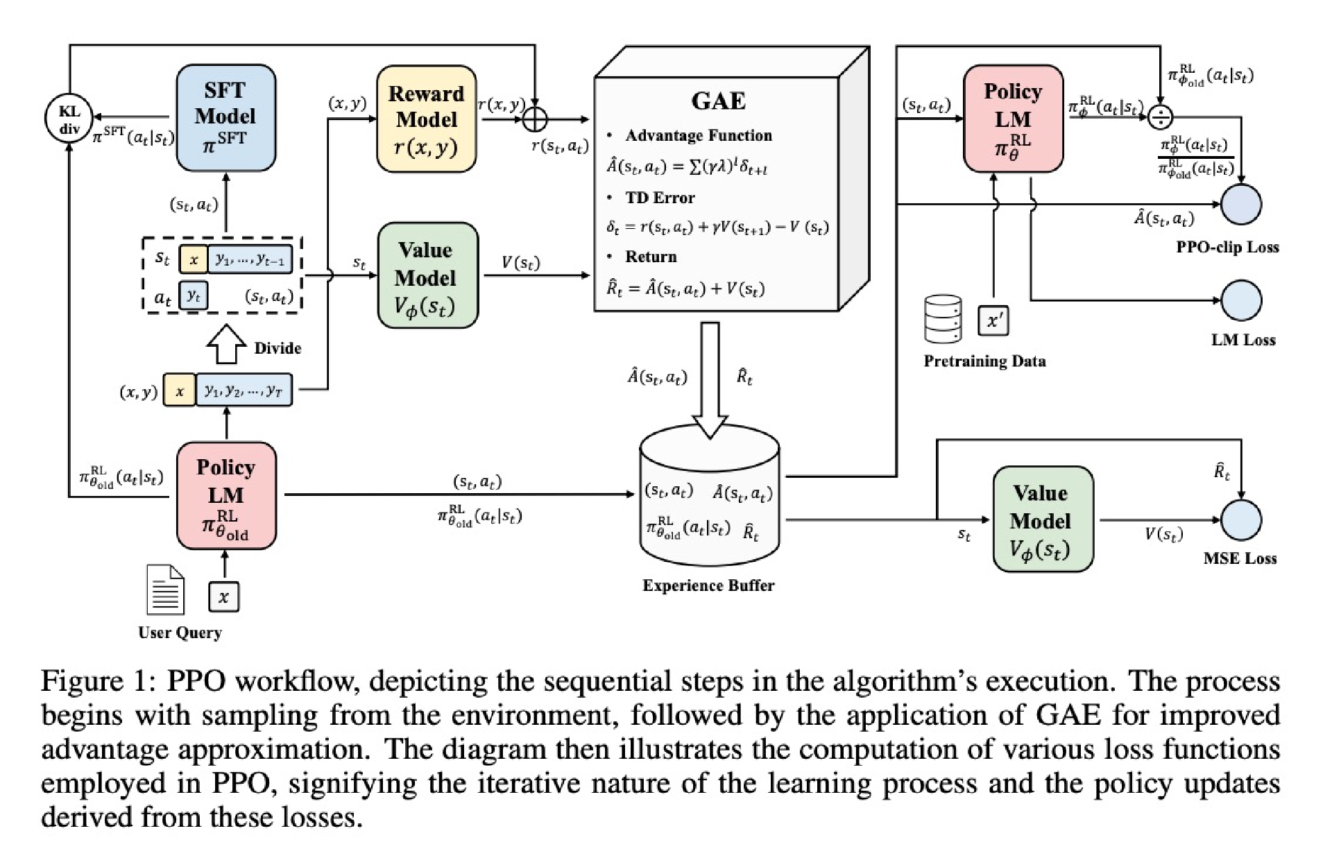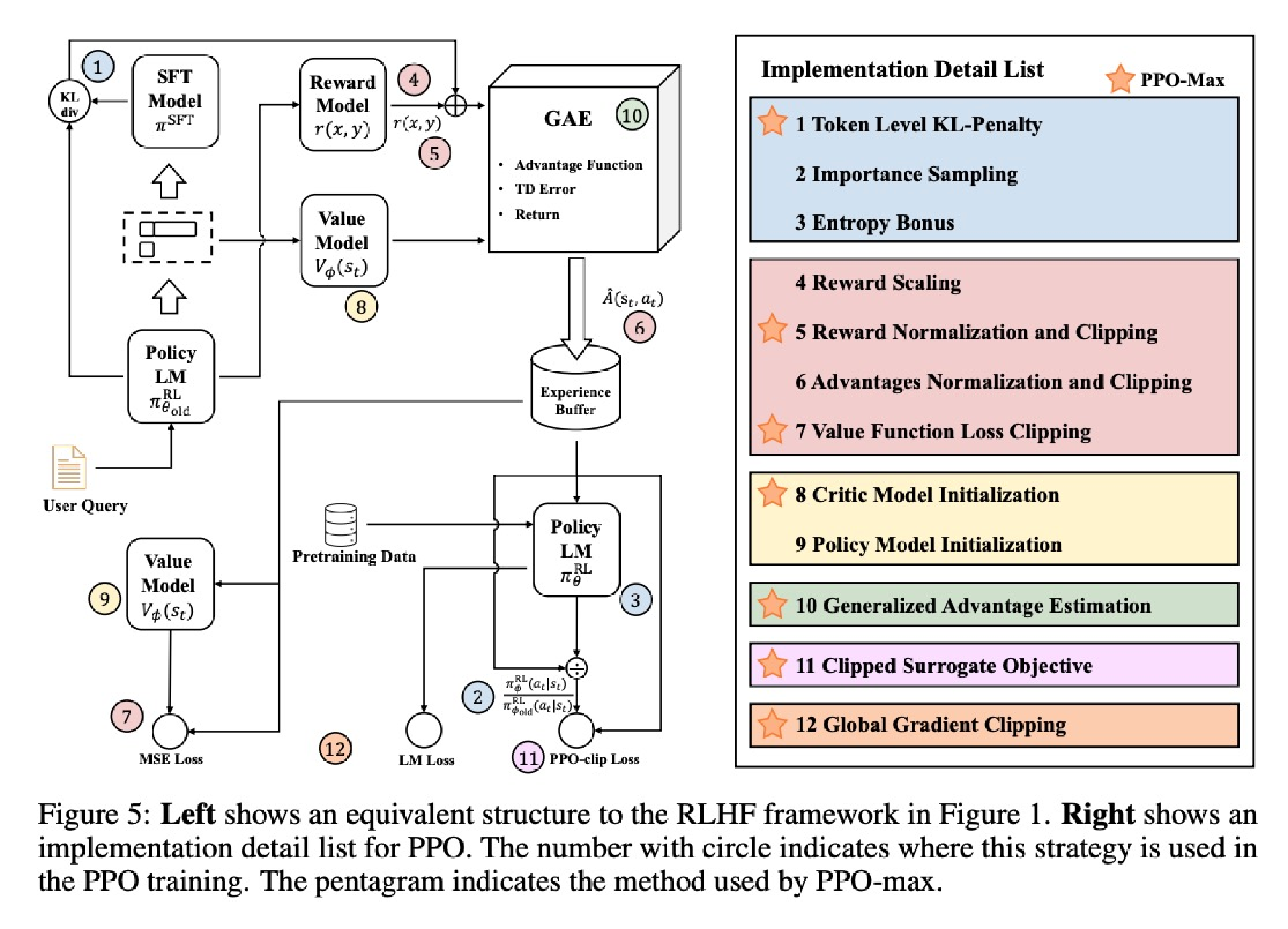 奖励模型 负责对大语言模型的输出打分,提供反馈信号。PPO 通过这些反馈信号稳定地优化模型策略,确保训练过程平稳有效。ChatGPT内部实现我们无法获得,下面是一个开源的RLHF的实现流程图,可以更好地说明这个过程。其中图1是一个基于奖励模型的PPO流程。图2是更详细的PPO策略和流程图。