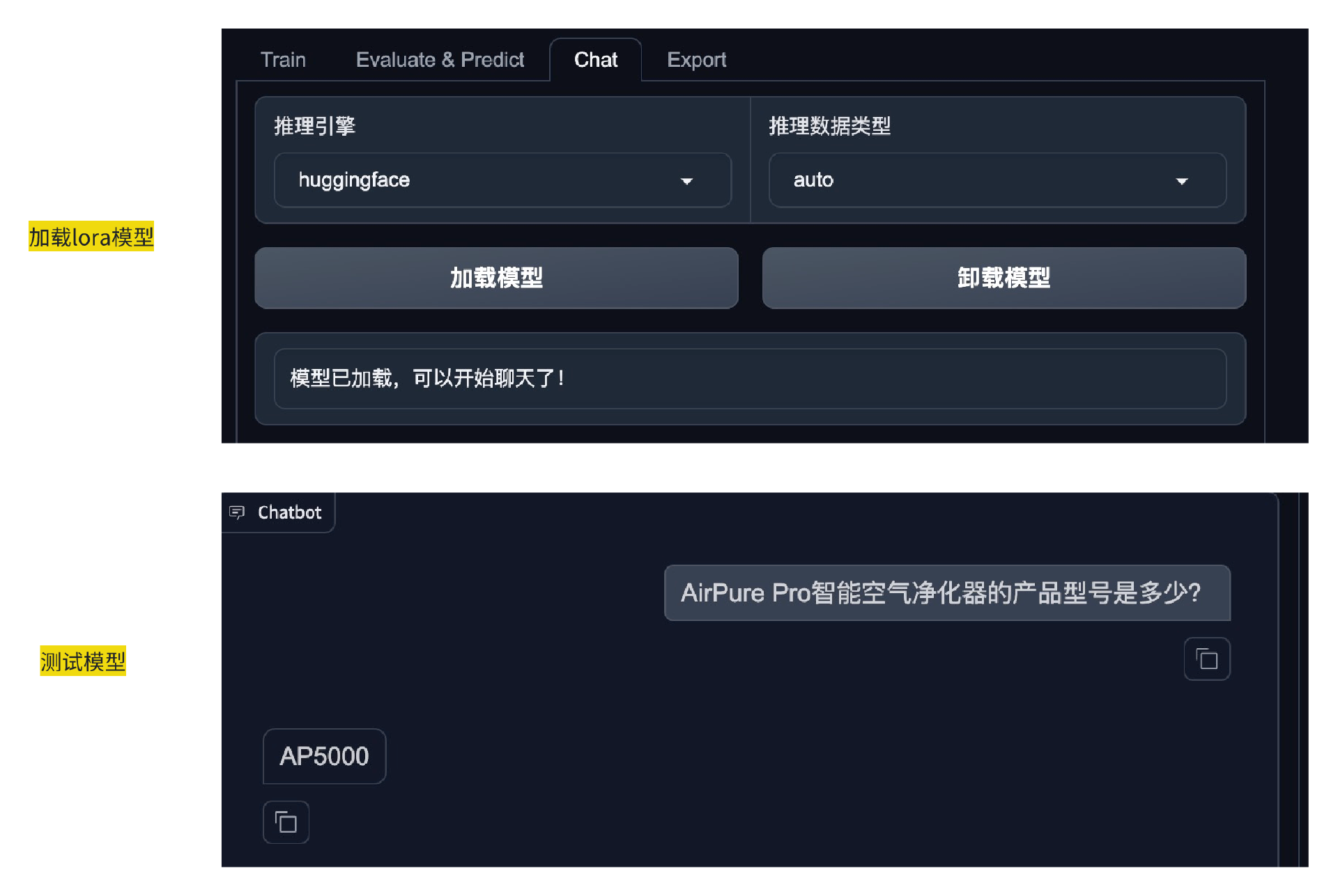 微调完成后,在这个界面的 Chat 中选择加载刚才微调后的LoRA模型。然后就可以针对产品提问测试了。