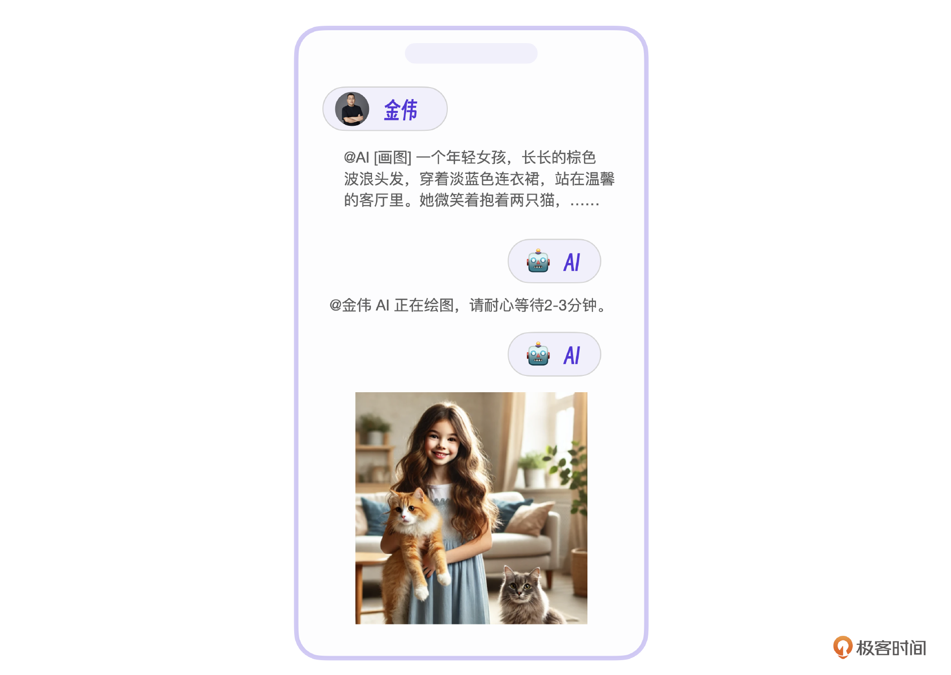 图片视频,顾名思义,就是图片拼接组成的视频。所以我们先来看最基础的AI图片开发。这里需要做的是扩展AI指令支持图片。要注意,因为AI生成图片速度较慢,所以在实际的用户交互里,可以先回复一条消息让用户等待,避免用户产生焦虑。