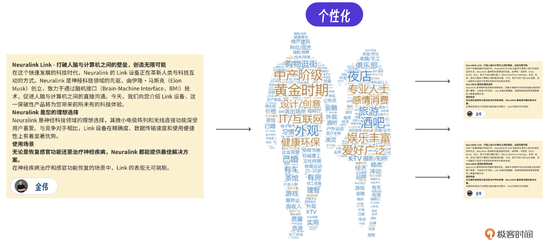营销文章AIGC 先说营销文章功能,他其实是整个AI营销系统的核心功能。下面有一张示意图,是我让AI写了一篇介绍极客时间的营销文章。产品的界面看起来很简单,不过呢,后端的实现其实总共经历了3个阶段,微调+信息储备,增加规则引擎以及GPT改写。