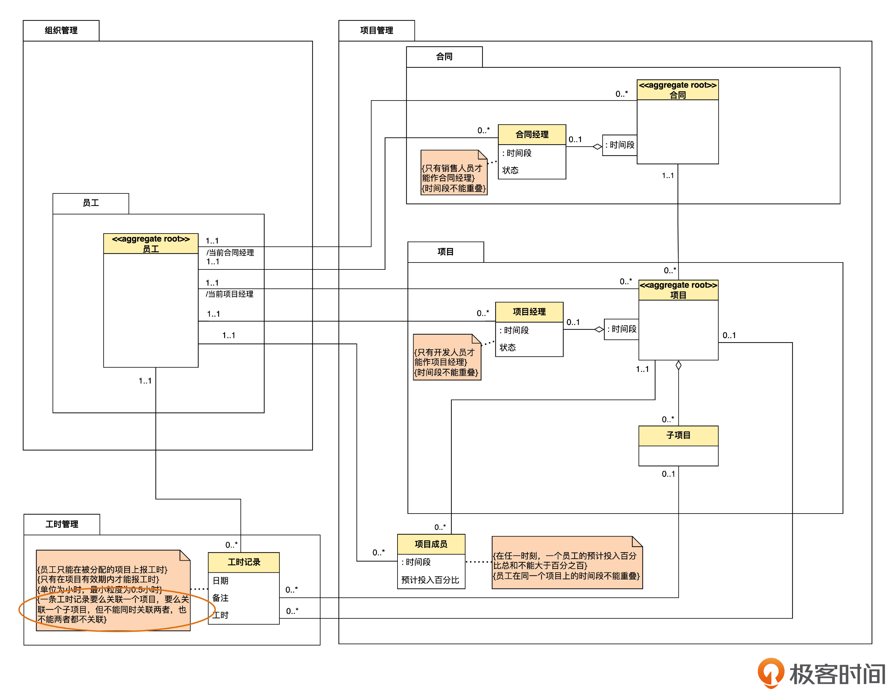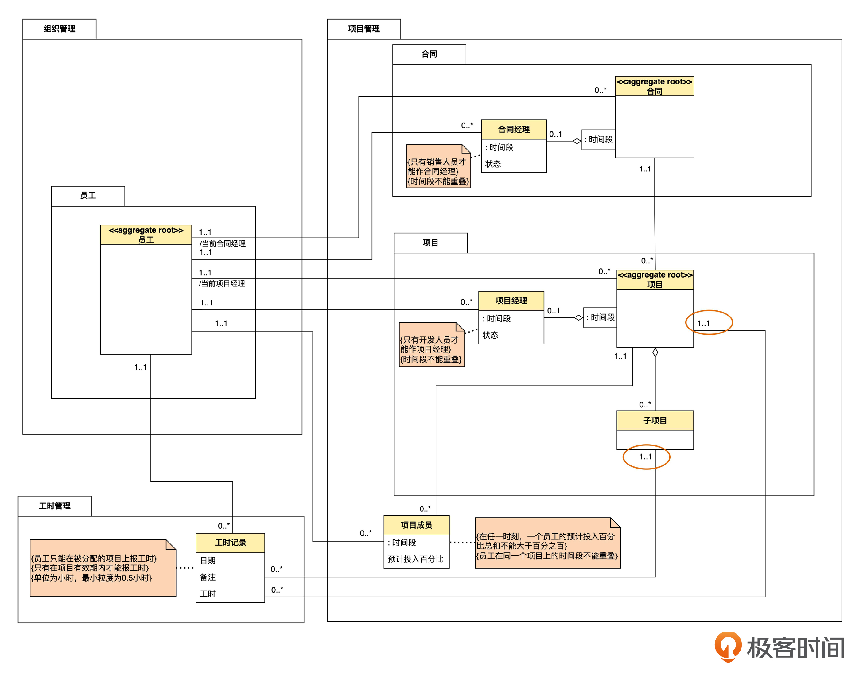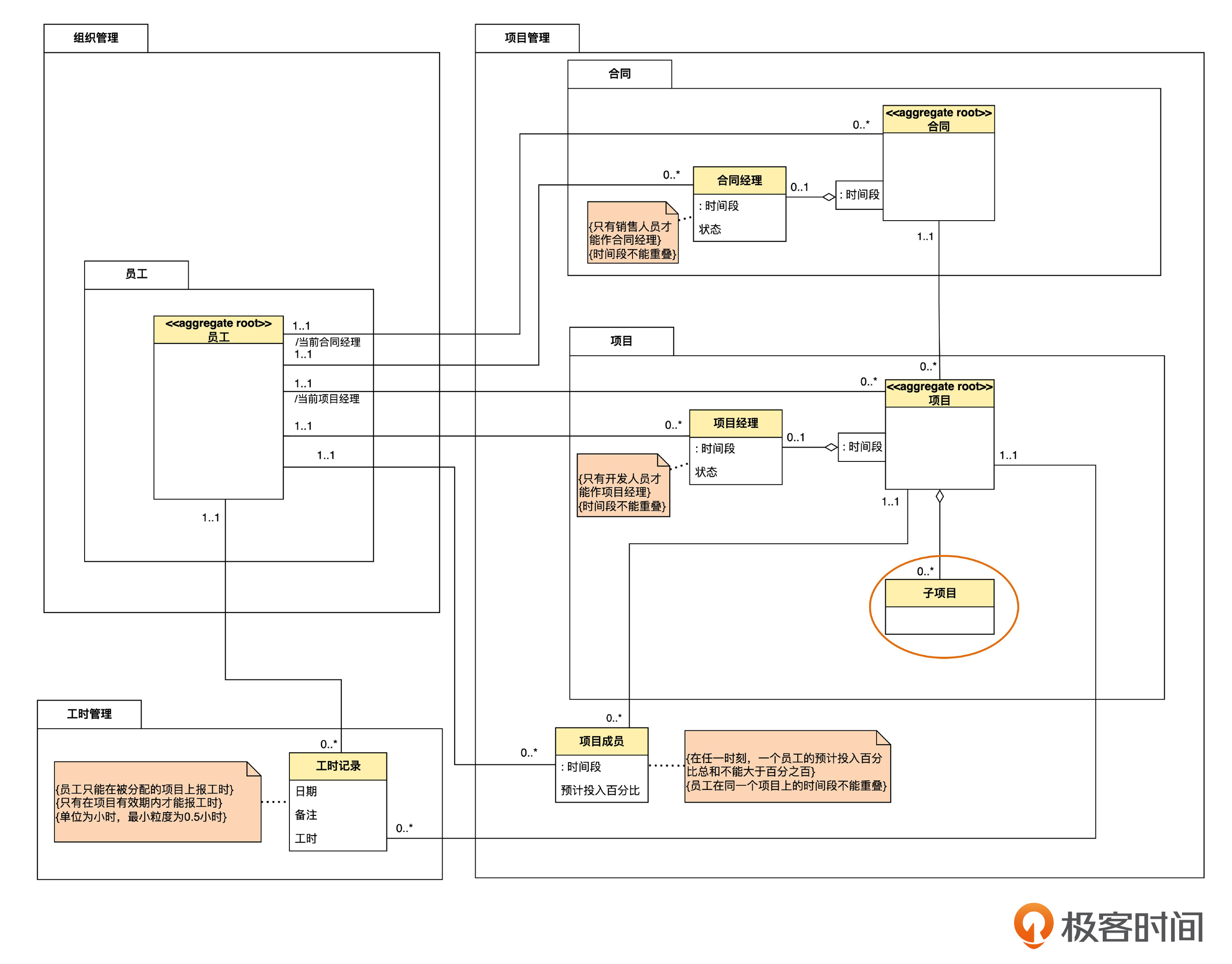 正确的逻辑应该是:一条工时记录要么关联一个项目,要么关联一个子项目,但不能同时关联两者,也不能两者都不关联。运用目前我们已经掌握的建模技术,只能用注释的形式增加一个约束。
