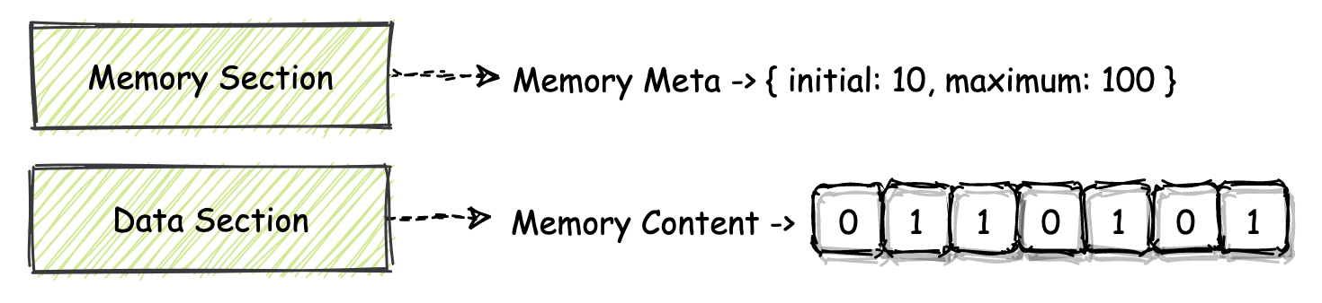 同样地,在 Memory Section 中,也只是存放了描述模块线性内存属性的一些元信息,如果要为线性内存段填充实际的二进制数据,我们还需要使用另外的 Data Section。Data Section 的 ID 为 11。