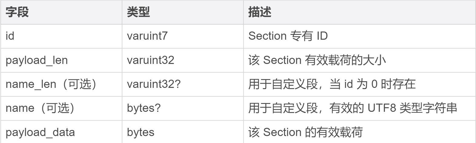 对于 Type Section 来说,它的专有 ID 是 1。紧接着排在“头部”后面的便是这个 Section 相关的有效载荷信息(payload_data)。注意,每个不同类型的 Section 其有效载荷的结构都不相同。比如,Type Section 的有效载荷部分组成如下表所示。