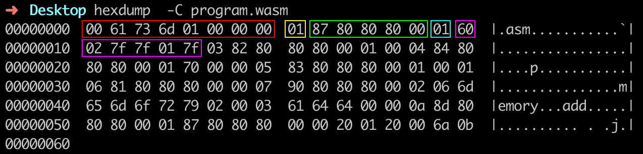你可以看到,最开始红色方框内的前八个字节 “0x0 0x61 0x73 0x6d 0x1 0x0 0x0 0x0” 便是我们之前介绍的, Wasm 模块文件开头的“魔数”和版本号。这里需要注意地址增长的方向是从左向右。