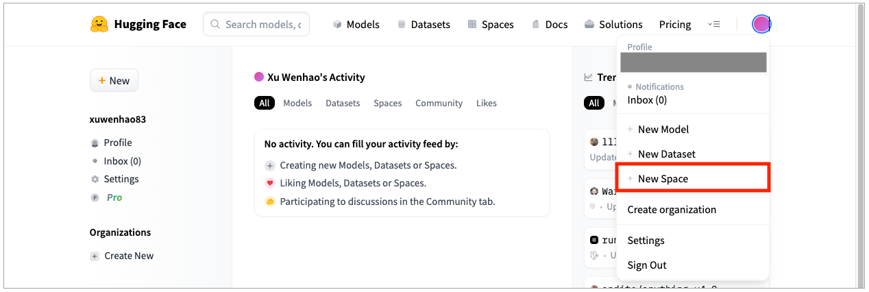 - 首先你需要注册一个HuggingFace的账号,点击左上角的头像,然后点击 “+New Space” 创建一个新的项目空间。