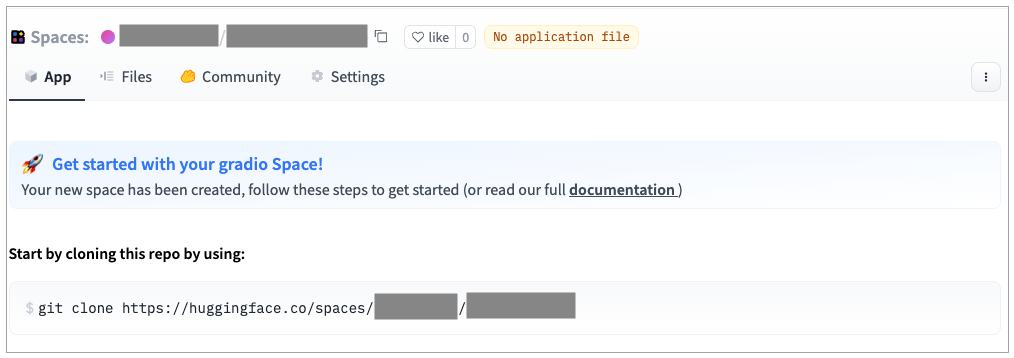 - 创建成功后,会跳转到HuggingFace的App界面。里面给了你如何Clone当前的space,然后提交代码部署App的方式。我们只需要通过Git把当前space下载下来,然后提交两个文件就可以了,分别是: