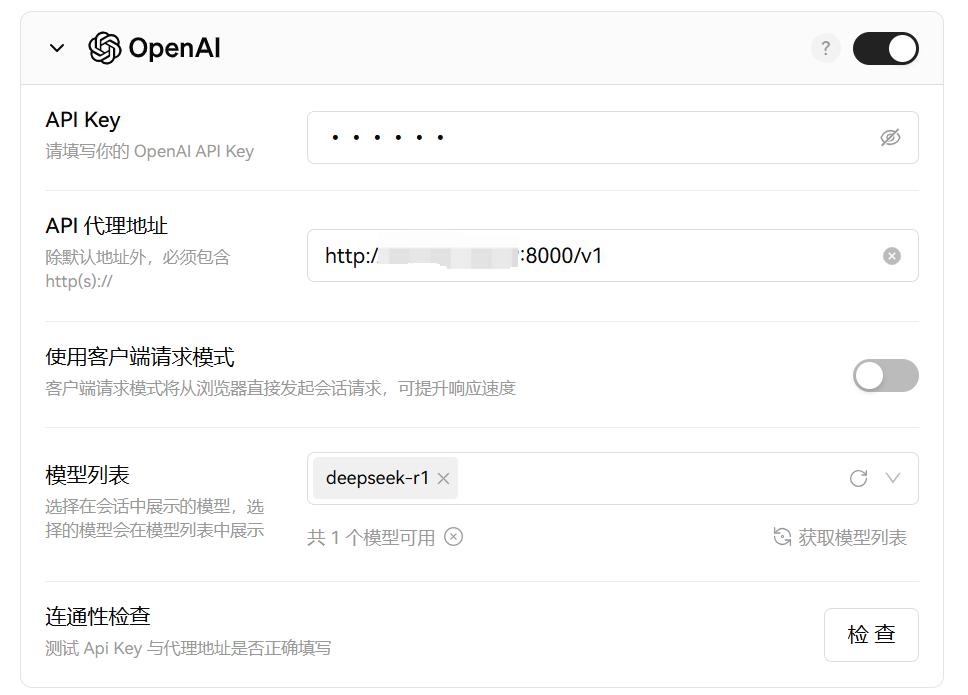 在 [Ollama 那节课],我们讲过 LobeChat。通过 docker 一键拉起 LobeChat 后,点击设置,语言模型,在 OpenAI 模型中输入上文命令中的 Server 地址,点击获取模型列表,即可获取到可用模型。