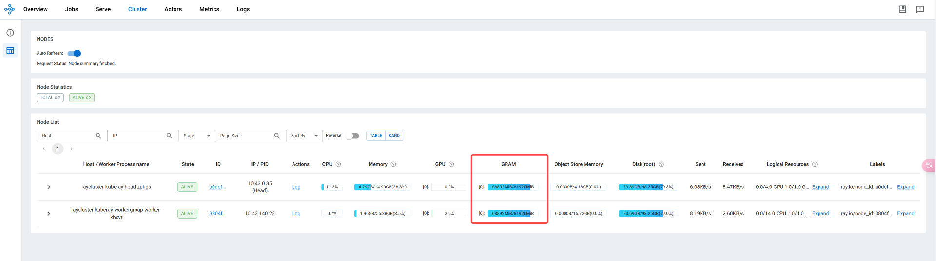 这时我们再看一下 Ray 集群情况: