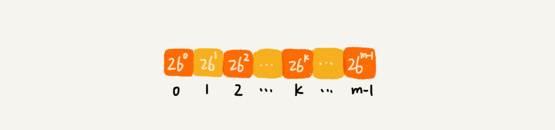 不过,这里有一个小细节需要注意,那就是26^(m-1)这部分的计算,我们可以通过查表的方法来提高效率。我们事先计算好26^0、26^1、26^2……26^(m-1),并且存储在一个长度为m的数组中,公式中的“次方”就对应数组的下标。当我们需要计算26的x次方的时候,就可以从数组的下标为x的位置取值,直接使用,省去了计算的时间。