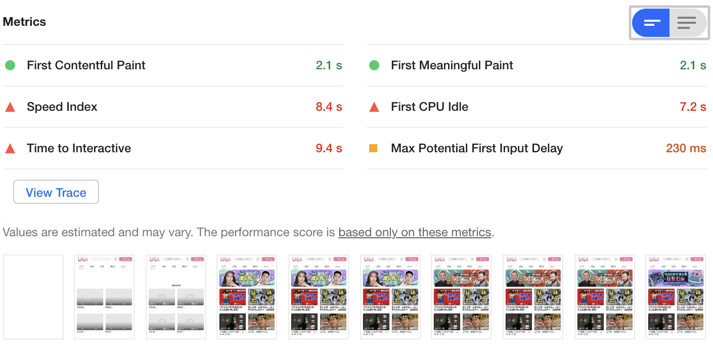 观察上图,我们可以发现性能指标下面一共有六项内容,这六项内容分别对应了从Web应用的加载到页面展示完成的这段时间中,各个阶段所消耗的时长。在中间还有一个View Trace按钮,点击该按钮可以跳转到Performance标签,并且查看这些阶段在Performance中所对应的位置。最下方是加载过程中各个时间段的屏幕截图。