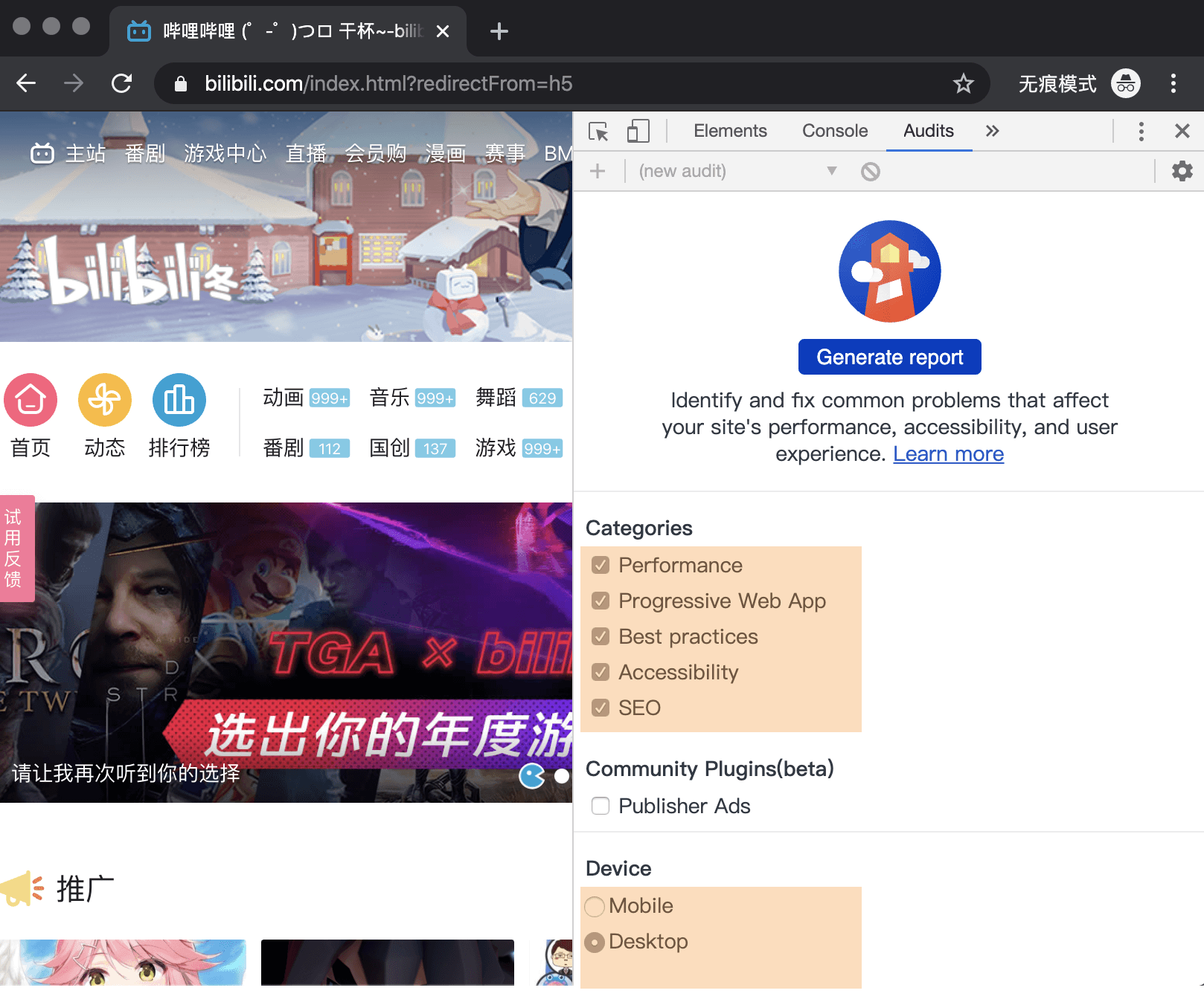 环境准备好了之后,我们就可以生成站点在加载阶段的性能报告了,这里我们可以拿B站作为分析的列子。