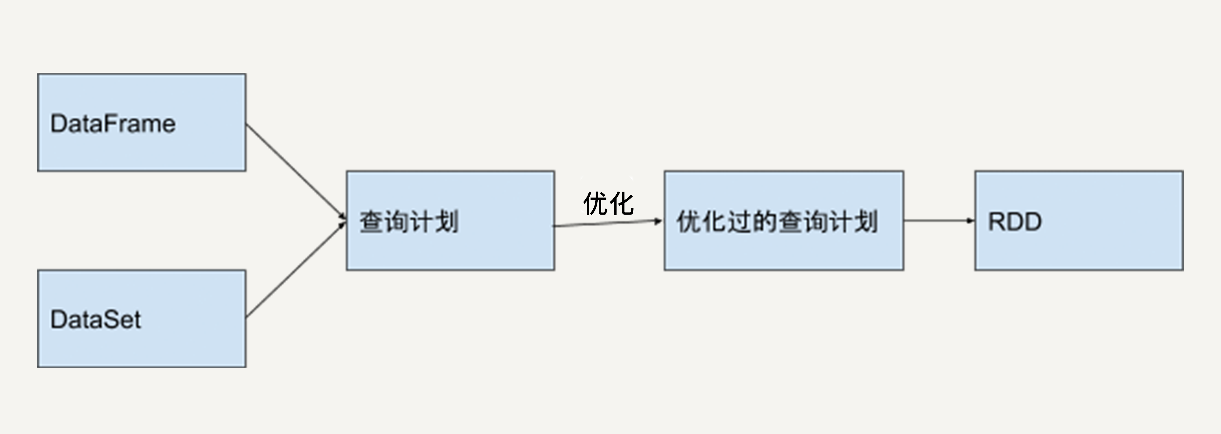 如果用RDD API实现这一语句,在执行时它只会机械地按顺序执行。而如果用DataFrame/DataSet API,Spark SQL的Catalyst优化器会将Filter操作和GroupBy操作调换顺序,从而提高执行效率。
