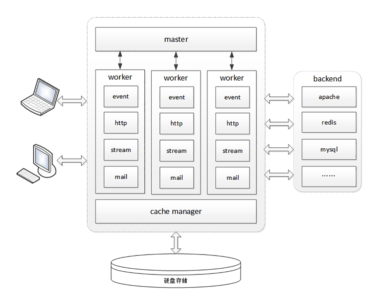 - Nginx采用“master/workers”进程池架构,不使用多线程,消除了进程、线程切换的成本;