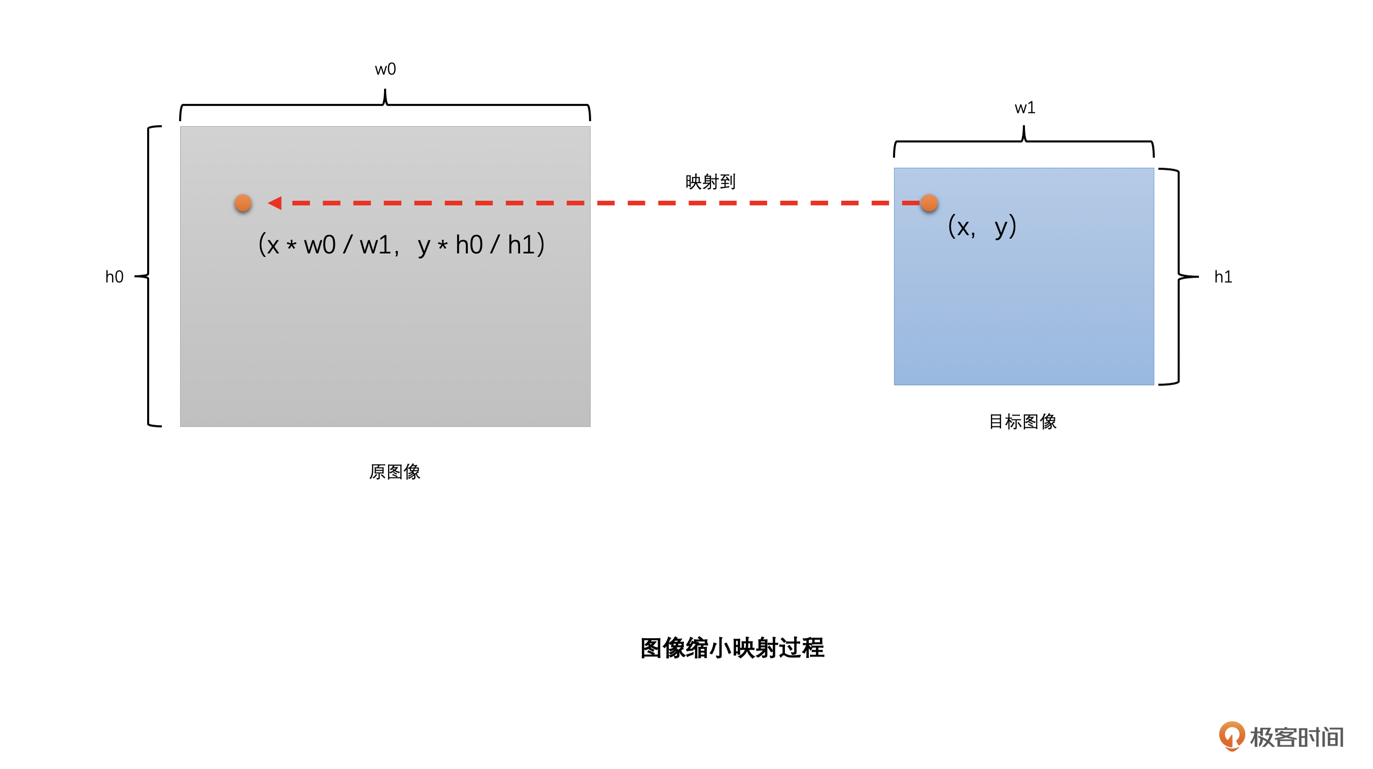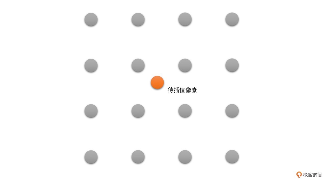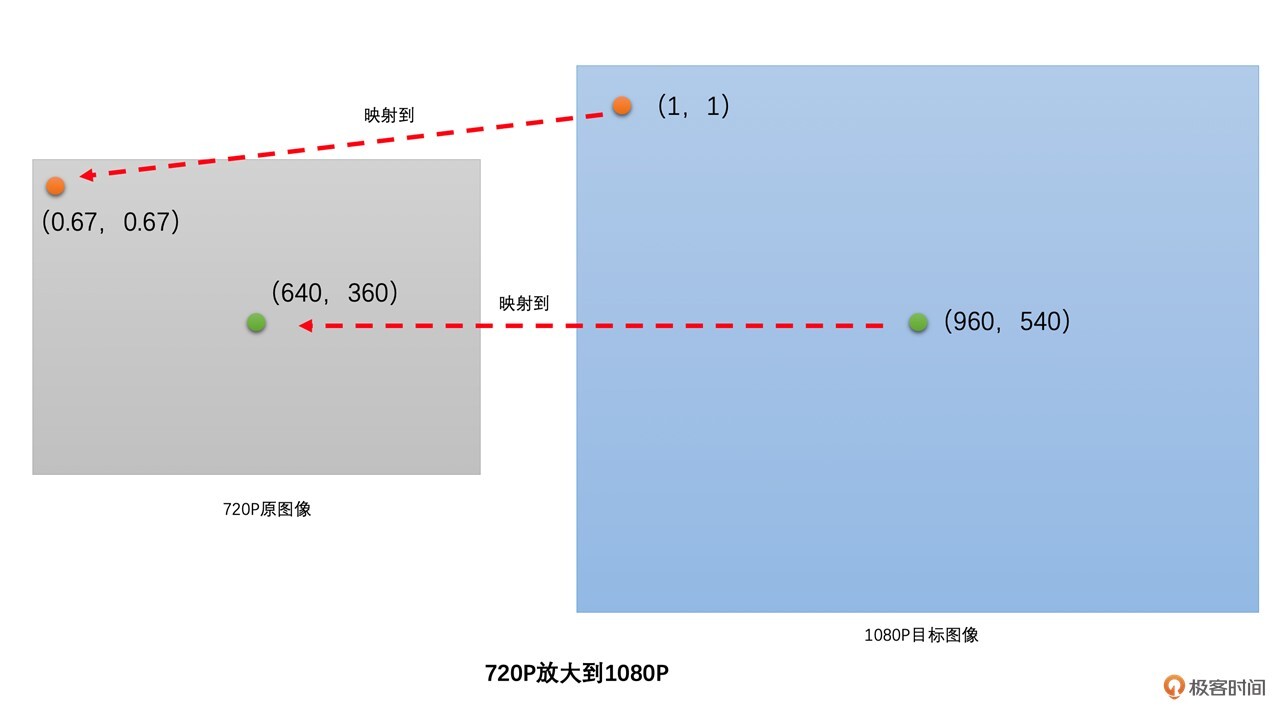 **那怎么通过720P的原图像生成1080P的目标图像呢?**我们先将目标图像的像素位置映射到原图像的对应位置上,然后把通过插值计算得到的原图像对应位置的像素值作为目标图像相应位置的像素值。是不是有点绕?别急,下面我给你举个例子,通过它你就可以更直观地理解这句话的意思了。