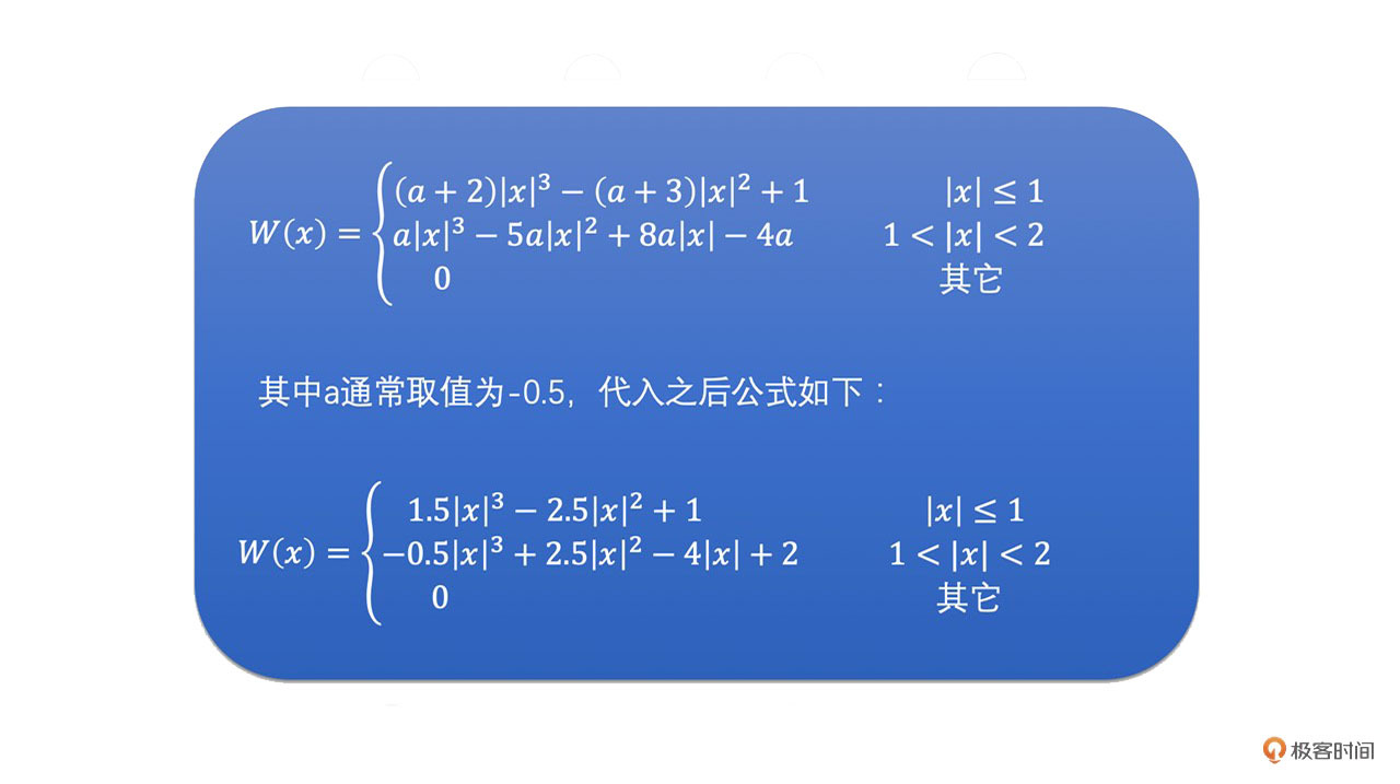 第二,双三次插值算法的周围像素的权重计算是使用一个特殊的BiCubic基函数来计算的。