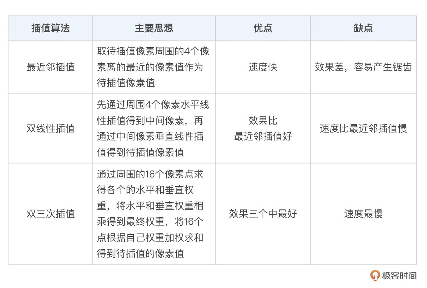 插值过程主要会使用到插值算法。我们今天介绍了最常用的三种插值算法,分别是最近邻插值、双线性插值和双三次插值算法。三种算法的思想和优缺点如下表所示。