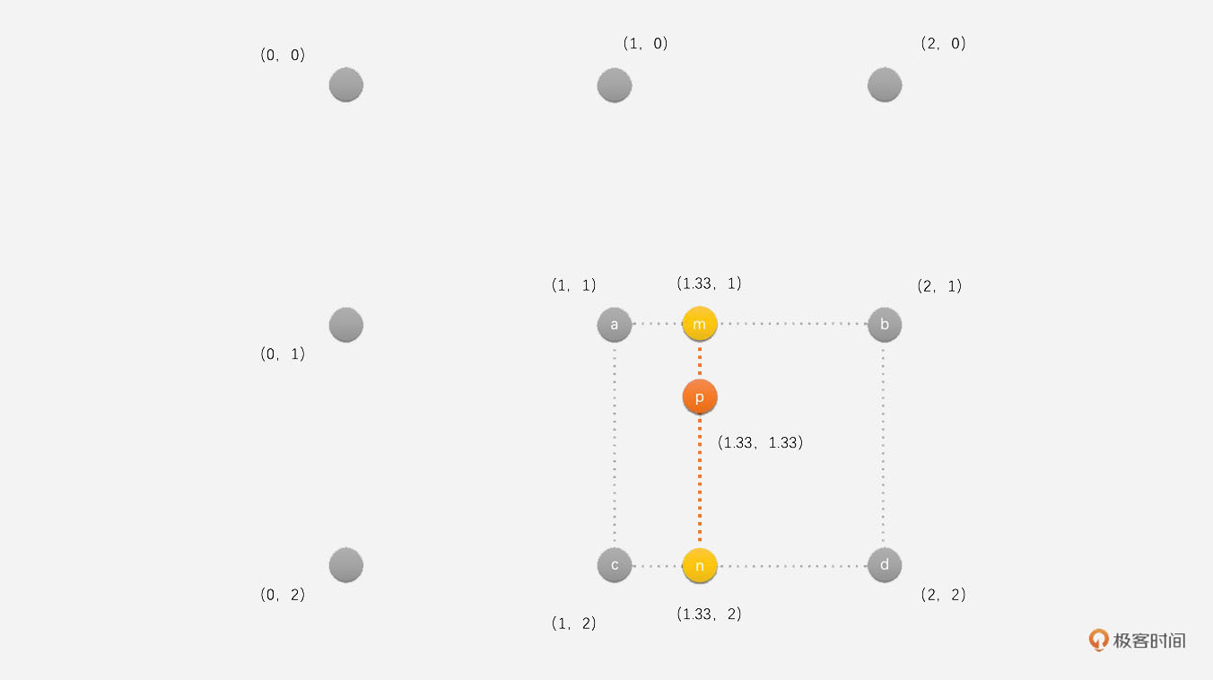 先通过这4个像素插值得到中间像素m和n的像素值。m和n的坐标分别为(1.33,1)和(1.33,2)。通过上面的公式可以求得点p(1.33,1.33)的像素值是: