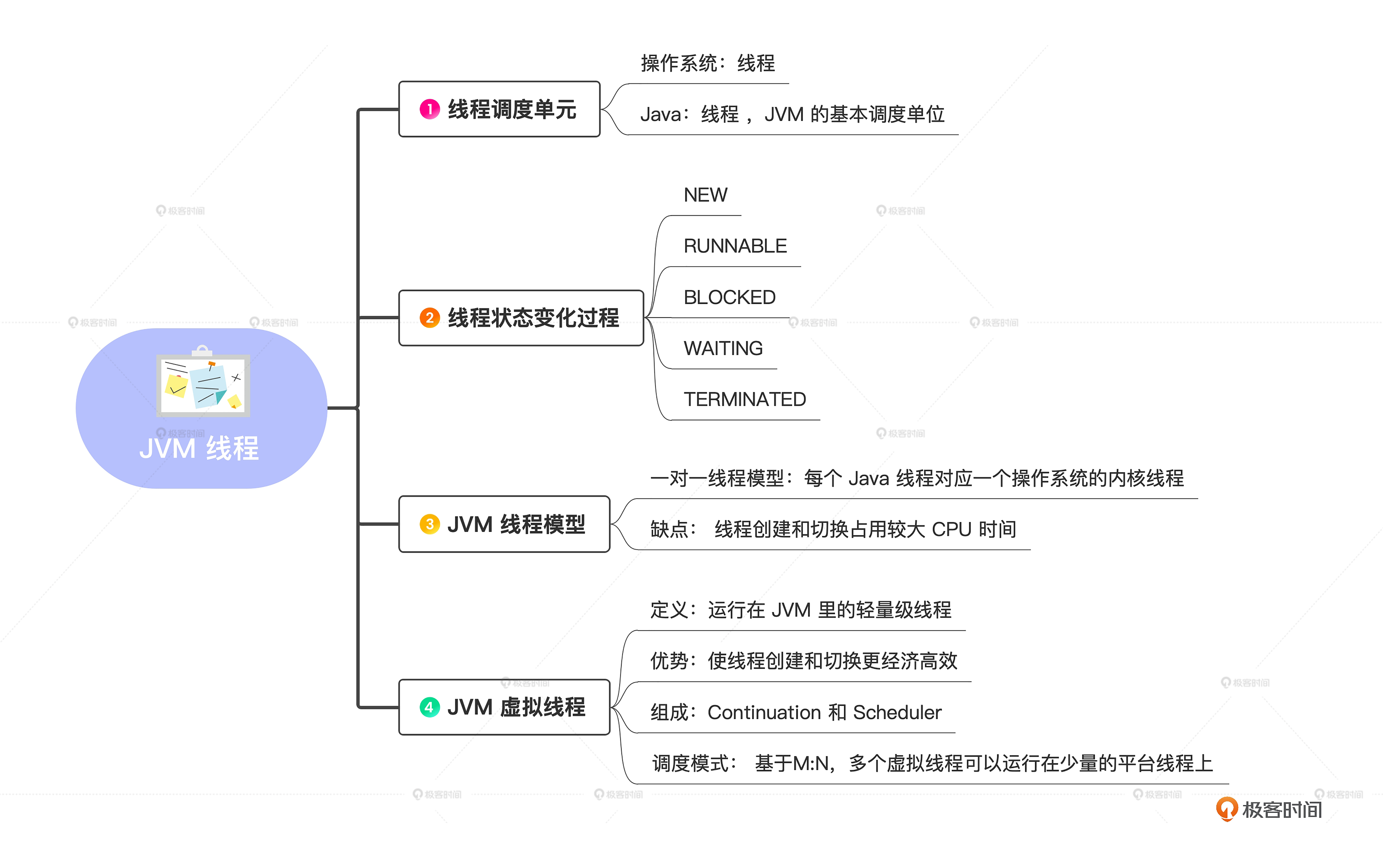 进程是操作系统中的基本调度单位,而在Java中,线程是JVM的基本调度单位。线程状态的变化是从NEW到RUNNABLE,再到BLOCKED、WAITING和TERMINATED的过程。Java中采用了一对一的线程模型,也就是说每个Java线程对应一个操作系统的内核线程。这种模型的缺点在于线程的创建和切换会占用较大的CPU时间。为了解决这个问题,JVM引入了虚拟线程。虚拟线程是运行在JVM里的轻量级线程,它可以使线程的创建和切换更加经济高效。