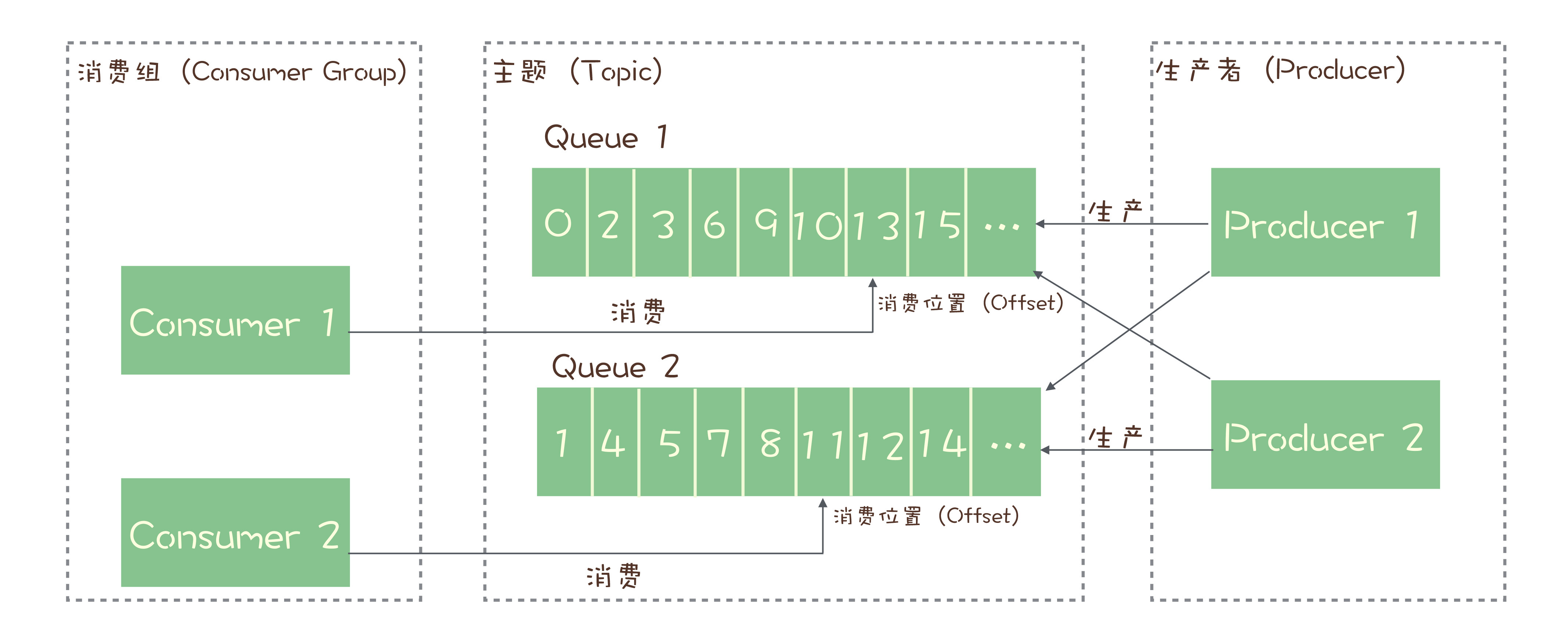 我们再来看看另一种常见的消息队列Kafka,Kafka的消息模型和RocketMQ是完全一样的,我刚刚讲的所有RocketMQ中对应的概念,和生产消费过程中的确认机制,都完全适用于Kafka。唯一的区别是,在Kafka中,队列这个概念的名称不一样,Kafka中对应的名称是“分区(Partition)”,含义和功能是没有任何区别的。