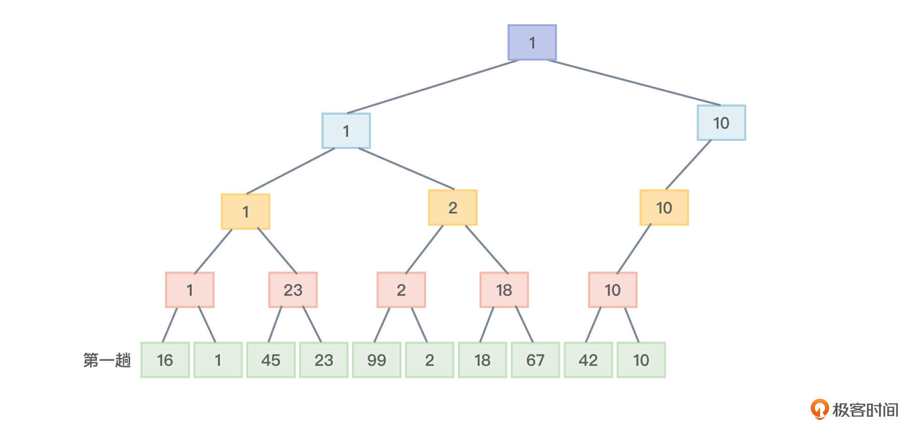 - 第一趟,两两比较,找到最小值保存到根节点中,如图3所示。