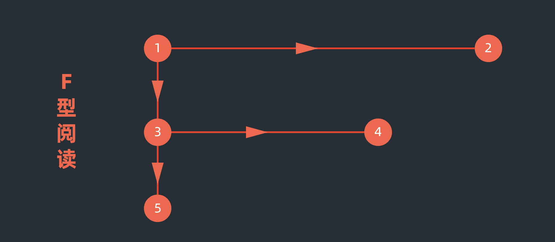 F型阅读用户的视线首先是水平移动,通常浏览内容区域的顶部,这构成了F上面那一横。接下来,用户的视线会沿着屏幕左侧的垂直线从上到下移动,从而找到段落里他们感兴趣的点。如果他们发现了感兴趣的句子,视线就会形成第二条水平线。但是通常这条线会比之前的水平线短些,这构成了F下面那条短一点的横线。