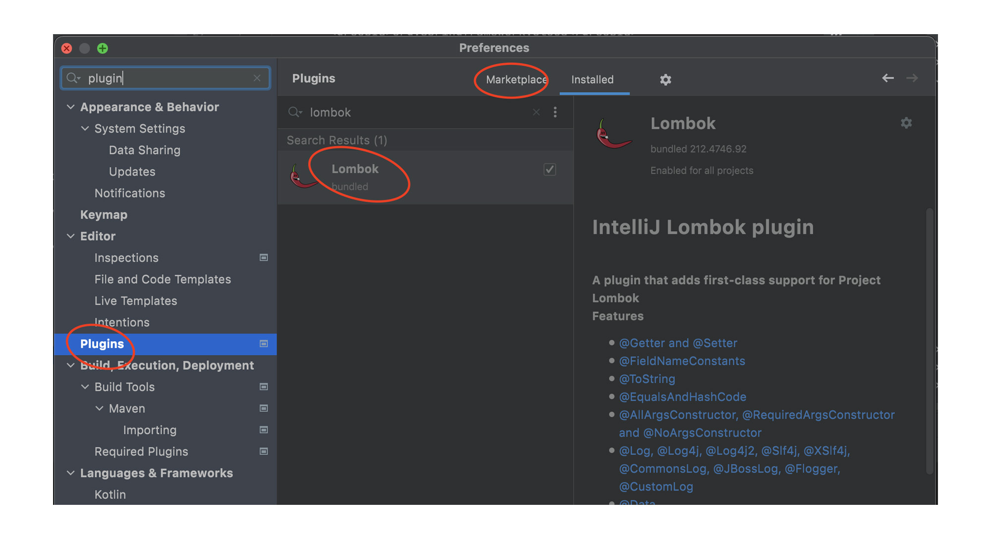在IntelliJ IDEA中安装Lombok非常简单,你只需要在IDEA的插件安装界面搜索Lomkob这款插件并安装即可,如下图所示: