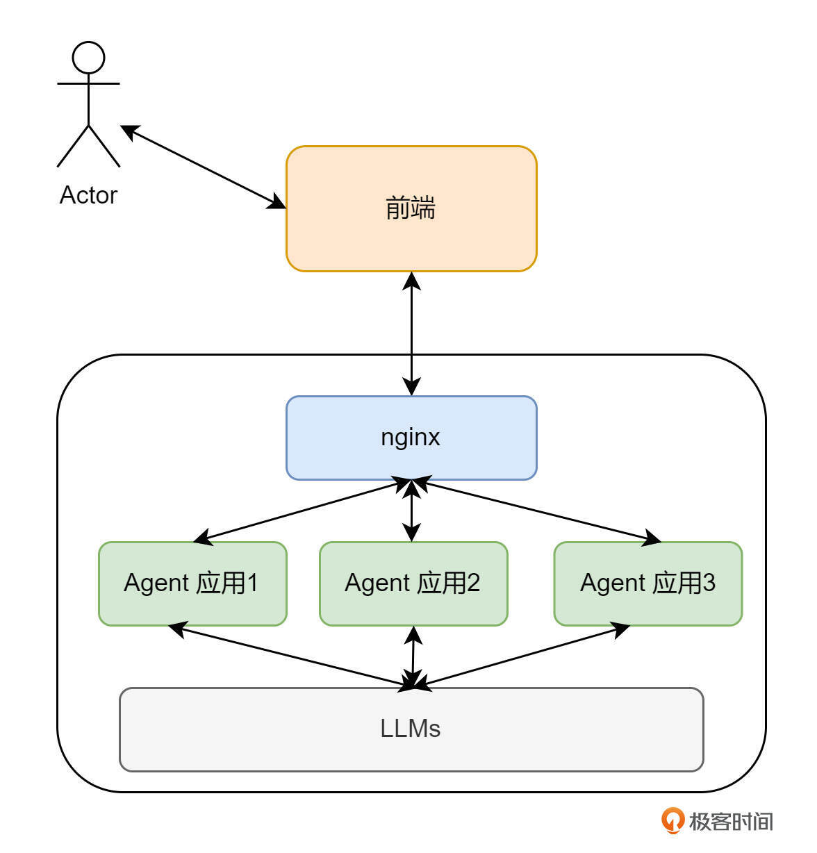 最后,我用一张图简化一下用 API 或 SDK 访问 Agent 应用的架构。