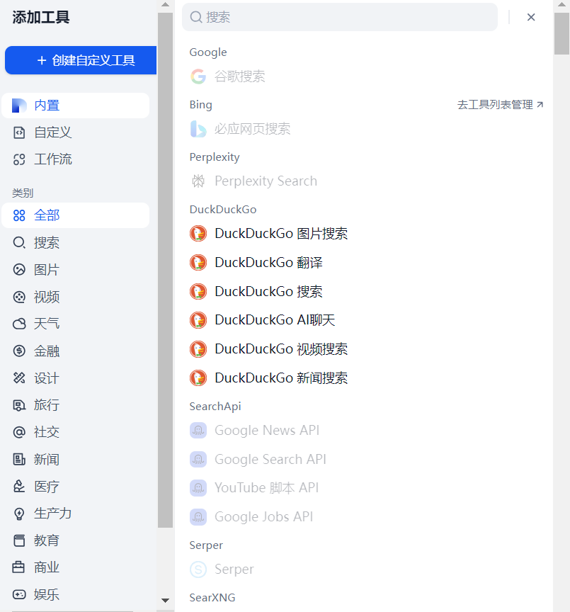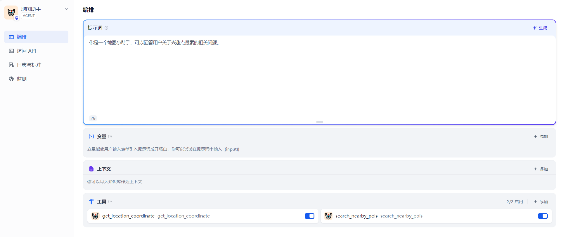 在这个页面可以填写提示词,也就是为我们的自定义应用赋一个人设。之后可以通过添加工具,为 Agent 赋予与外部环境沟通的能力。