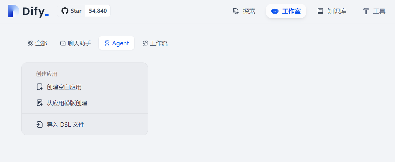 在注册完成后,会跳转到工作室的页面,这时候就可以体验 Dify 的功能了。